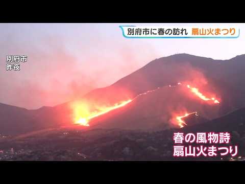大分県別府市で4月1日から開かれている「別府八湯温泉まつり」で、メイン行事の1つ「扇山火まつり」が2日夜開催され、炎が泉 ...